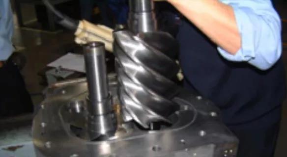 如果螺桿式壓縮機(jī)潤滑油乳化時(shí)間長、機(jī)體溫度過高,出現(xiàn)異響時(shí),就應(yīng)對(duì)壓縮機(jī)主機(jī)進(jìn)行拆解、清洗,并檢查各部件的磨損情況,然后重新組裝。