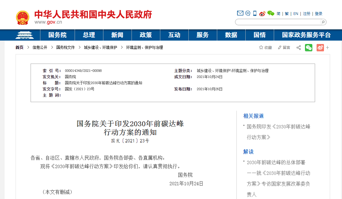 近日,國(guó)務(wù)院發(fā)布了《國(guó)務(wù)院關(guān)于印發(fā)2030年前碳達(dá)峰行動(dòng)方案的通知》。目標(biāo)是到2025年,非化石能源消費(fèi)比重達(dá)到20%左右,單位國(guó)內(nèi)生產(chǎn)總值能源消耗比2020年下降13.5%,單位國(guó)內(nèi)生產(chǎn)總值二氧化碳排放比2020年下降18%,為實(shí)現(xiàn)碳達(dá)峰奠定堅(jiān)實(shí)基礎(chǔ)。到2030年,非化石能源消費(fèi)比重達(dá)到25%左右,單位國(guó)內(nèi)生產(chǎn)總值二氧化碳排放比2005年下降65%以上,順利實(shí)現(xiàn)2030年前碳達(dá)峰目標(biāo)。